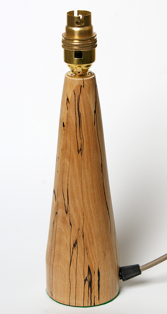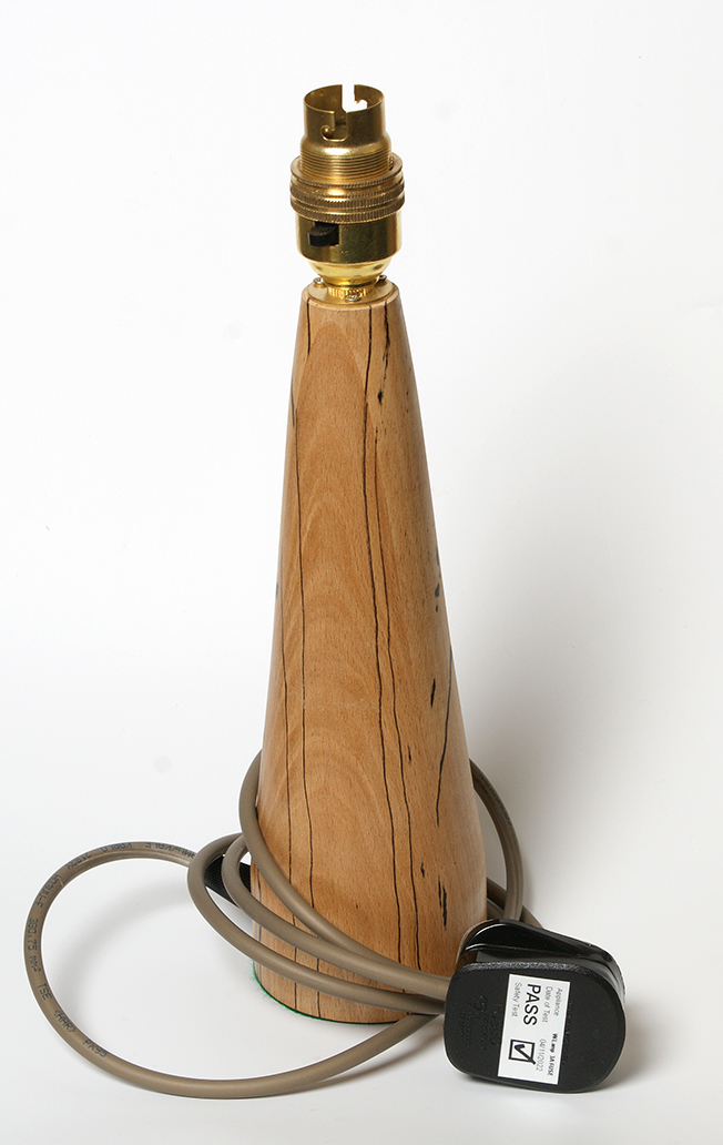 Hand turned on the lathe. This lamp is made from spalted beech wood. The wood is selected to give a lovely lined finish h in the wood. This is the spalted part and is a trees reaction to infection to protect itself. Old style brass bayonet fittings are used with three core earthed wire and wall plug (3amp fuse). They are 30cm tall to the top of the brass fitting.